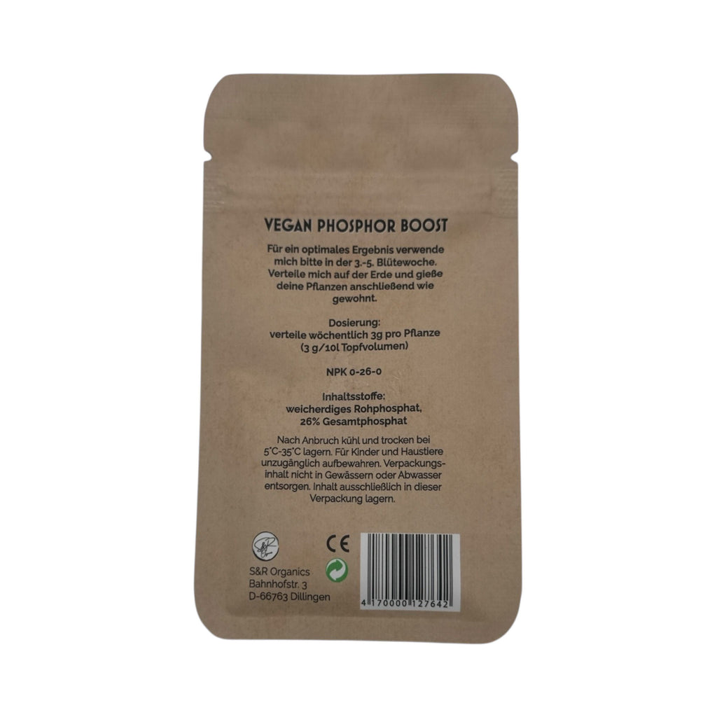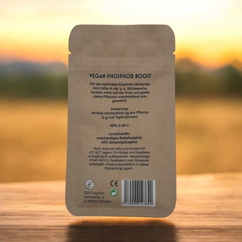 Dazu gibt es ein Vegan Phosphor Boost Pulver, 10/30 Gramm für 0,33/ 0,99 Quadratmeter Anbaufläche, für die 3. oder 4. Blütewoche je nach Blühdauer. Das Pulver wird ganz einfach auf der Erde verteilt oder ins Wasser eingerührt und gegossen. Einmalig anzuwenden! Im Preis enthalten.
